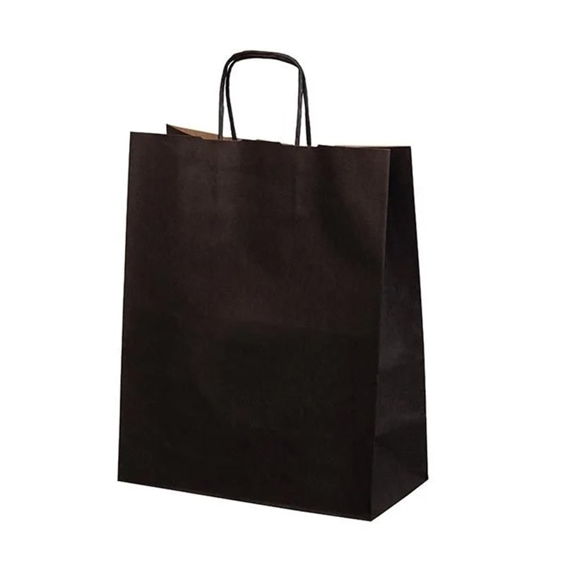 25 cm eninde, 31 cm boyunda ve 12 cm taban genişliğinde, baskısız, bükümlü saplı, 90 gr kağıt gramajında, kaliteli, iç kısmı natürel kahve kraft dış kısmı siyah zemin kağıt kraft çanta.