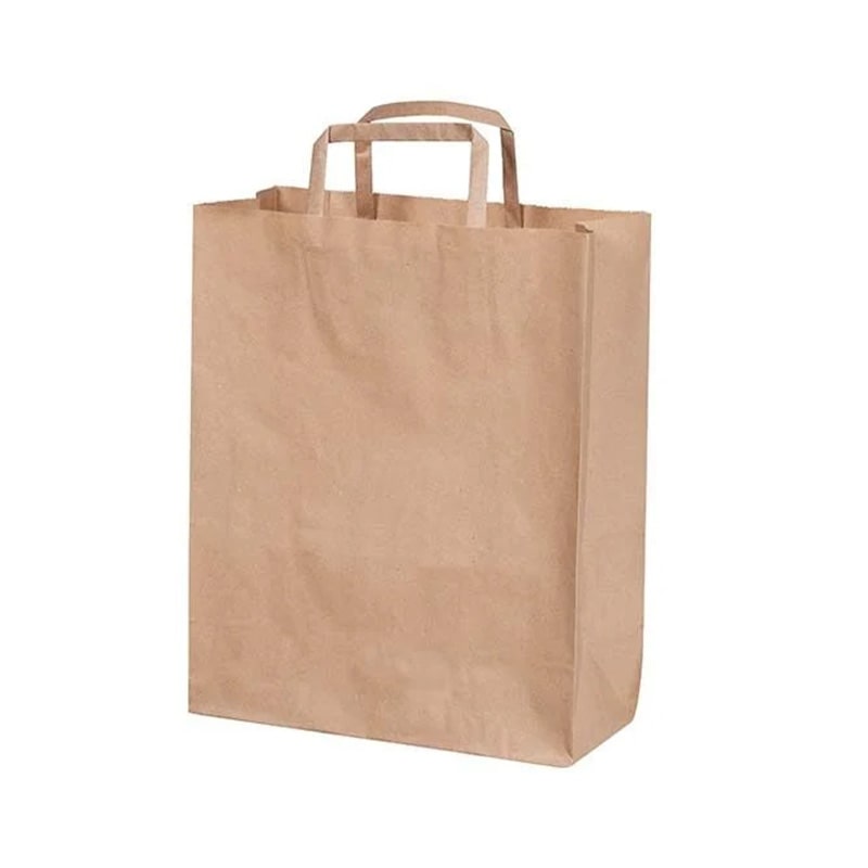 Naturel Kraft Çanta Düz Saplı Orta Boy 25 cm eninde, 31 cm boyunda ve 12 cm taban genişliğinde, baskısız, flat (düz) saplı, 70 gr kağıttan (ekonomik), natürel kraft kağıt çantadır.